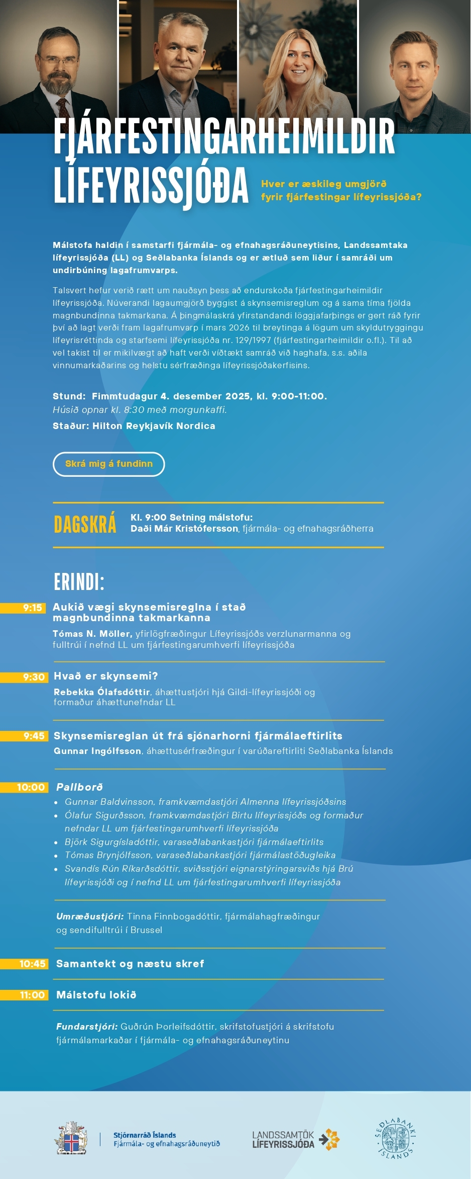 Málstofan er verkefni fjármála-og efnahagsráðuneytis, LL og Seðlabanka Íslands, sem liður í undirbúningi lagafrumvarps um fjárfestingarheimildir. Talsvert hefur verið rætt um nauðsyn þess að endurskoða fjárfestingarheimildir lífeyrissjóða. Núverandi lagaumgjörð byggist á skynsemisreglum og á sama tíma fjölda magnbundinna takmarkana. Á þingmálaskrá yfirstandandi löggjafarþings er gert ráð fyrir því að lagt verði fram lagafrumvarp í mars 2026 til breytinga á lögum um skyldutryggingu lífeyrisréttinda og starfsemi lífeyrissjóða nr. 129/1997 (fjárfestingarheimildir o.fl.). Til að vel takist til er mikilvægt að haft verði víðtækt samráð við haghafa, s.s. aðila vinnumarkaðarins og helstu sérfræðinga lífeyrissjóðakerfisins.